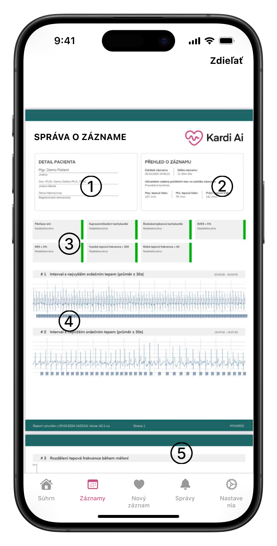 Súhrnná správa o zázname pre odovzdanie ošetrujúcemu lekárovi. Lekár má možnosť získať prístup k EKG záznamom pacienta z dlhodobého monitoringu Kardi Ai kontaktovaním zákazníckej podpory Kardi Ai.